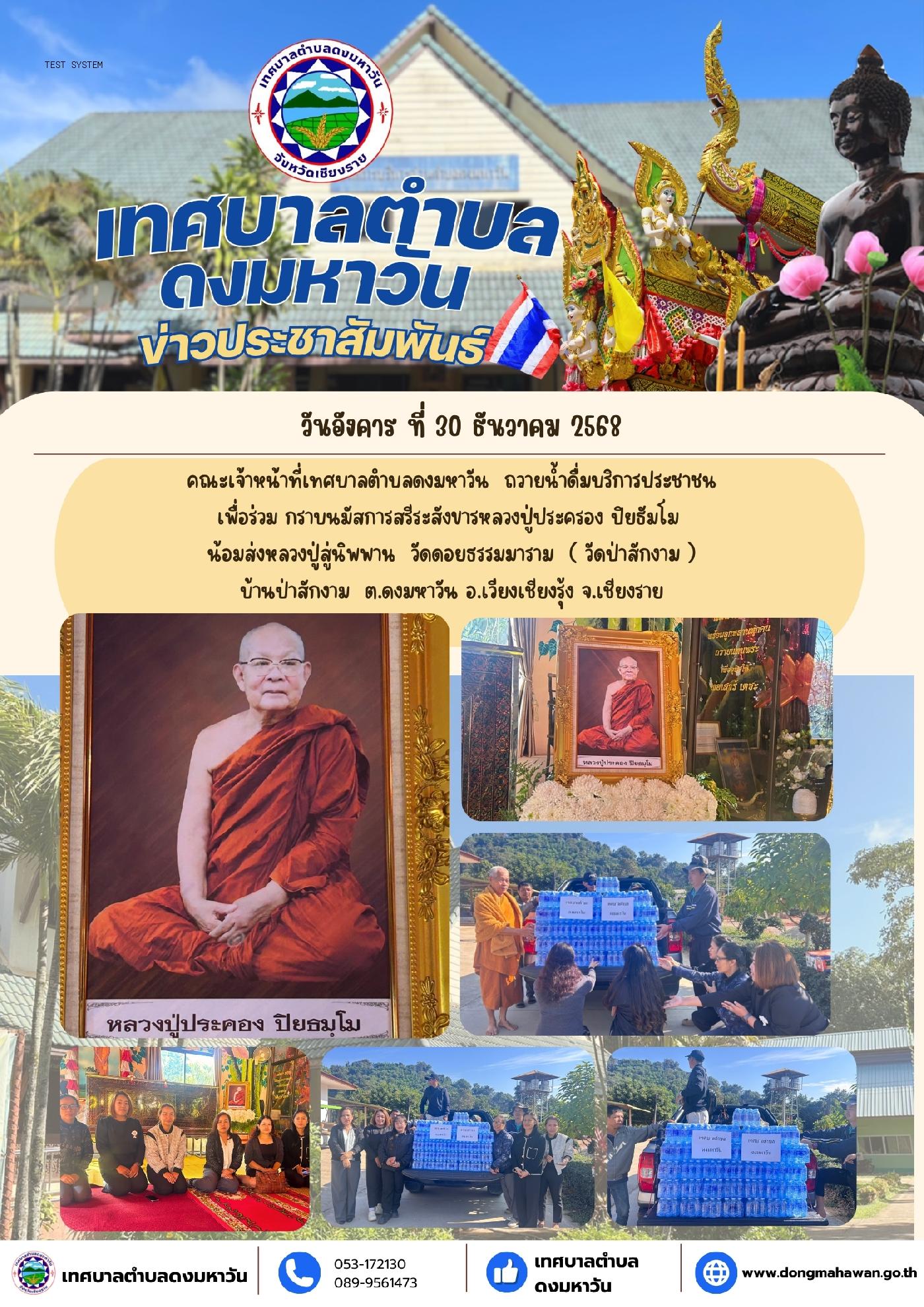 เทศบาลตำบลดงมหาวัน ถวายน้ำดื่มบริการประชาชน เพื่อร่วม กราบนมัสการสรีระสังขารหลวงปู่ประครอง ปิยธัมโม น้อมส่งหลวงปู่สู่นิพพาน