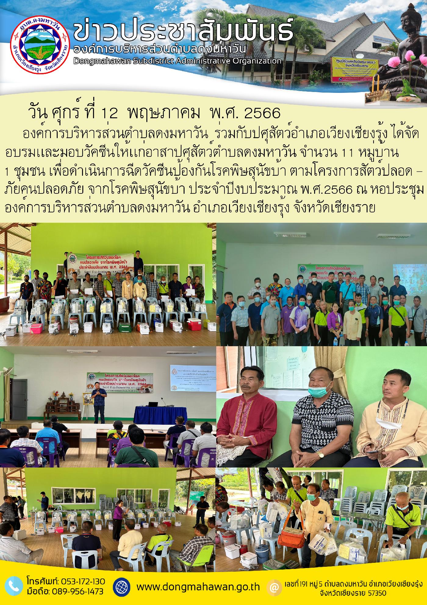 กิจกรรม อบรมเเละมอบวัคซีนเเก่อาสาปศุสัตว์ตำบลดงมหาวัน ในโครงการสัตว์ปลอดภัย คนปลอดภัย จากโรคพิษสุนัขบ้า ประจำปีงบประมาณ พ.ศ.2566