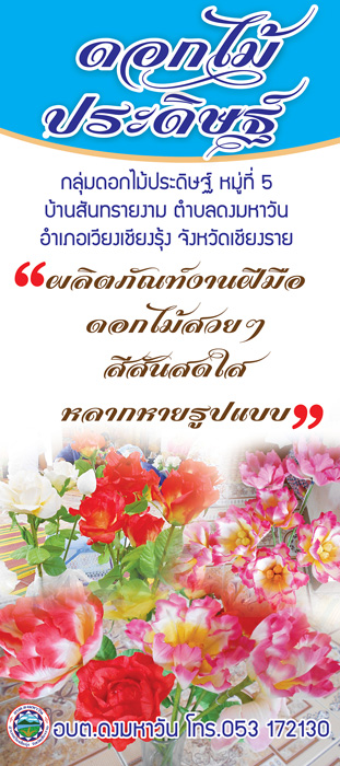 ที่ตั้ง :กลุ่มดอกไม้ประดิษฐ์ หมู่ที่ 5 บ้านสันไทรงาม ต.ดงมหาวัน อ.เวียงเชียงรุ้ง โทรศัพท์ 080-8285383 นางสมคิด สิทธิขันแก้ว