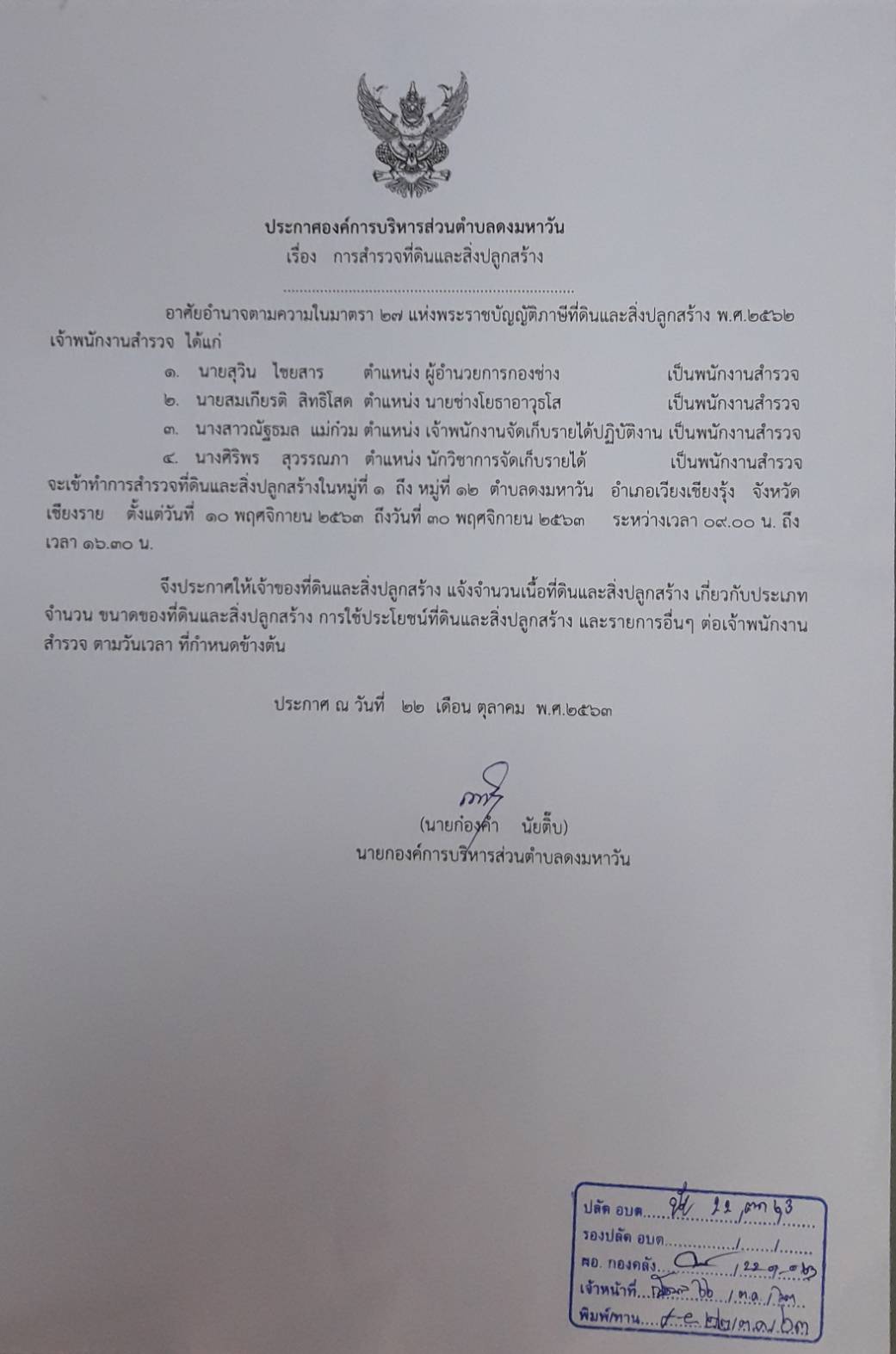 ประกาศองค์การบริหารส่วนตำบลดงมหาวัน เรื่อง การสำรวจที่ดินและสิ่งปลูกสร้าง