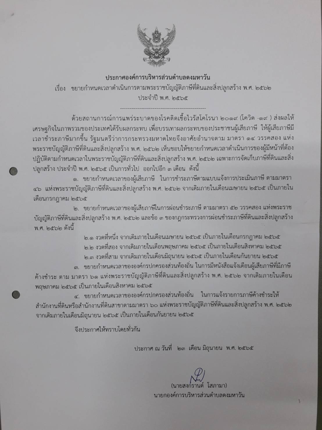 เรื่อง ประกาศขยายกำหนดเวลาดำเนินการตามพระราชบัญติภาษีที่ดินและสิ่งปลูกสร้าง พ.ศ.2562 ประจำปี พ.ศ.2565