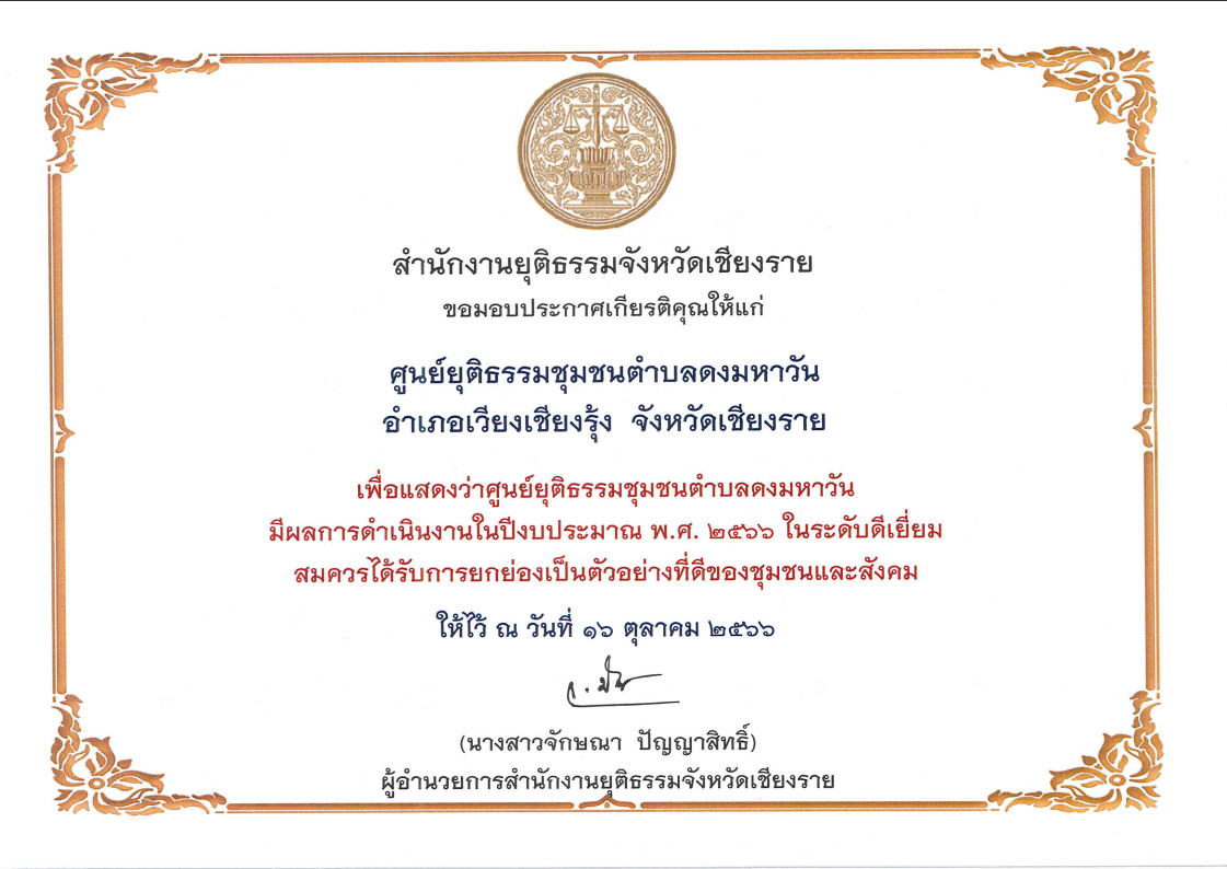 สำนักงานยุติธรรมจังหวัดเชียงรายมอบเกียรติบัติเเก่ ศูนย์ยุติธรรมชุมชนตำบลดงมหาวัน เพื่อเเสดงว่าศูนย์ยุติธรรมชุมชนตำบลดงมหาวันมีผลการดำเนินงานในปีงบประมาณ พ.ศ.2566 ในระดับดีเยี่ยม